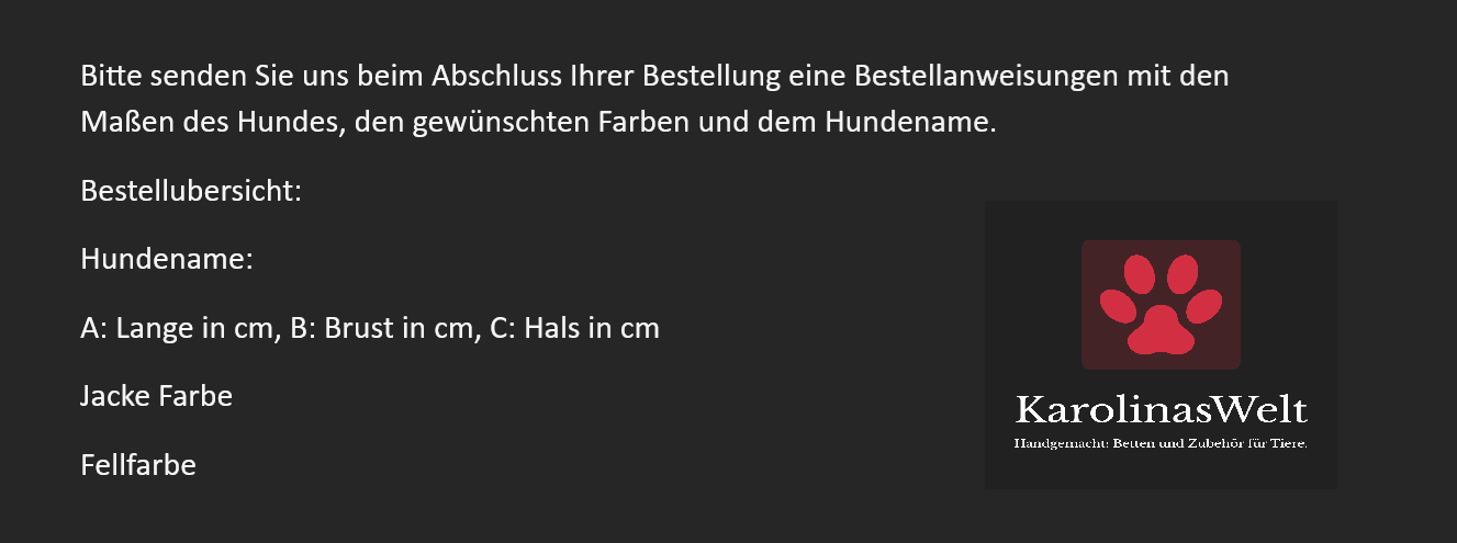 Bitte senden Sie uns beim Abschluss Ihrer Bestellung eine Bestellanweisungen mit den Maßen des Hundes, den gewünschten Farben und dem Hundename.